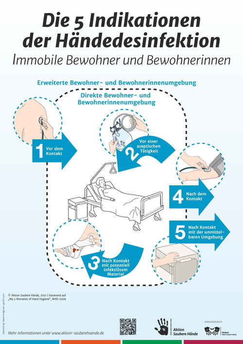 Die Indikationen für eine Händedesinfektion korrespondieren mit klar definierten Situationen aus dem Alltag der Bewohnerversorgung. Bei immobilen Bewohnerinnen oder Bewohnern wurde von der WHO ein Modell geschaffen, welches in der Formulierung von 5 Indikationsgruppen mündete.